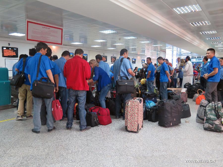 Chinese employees of a steel plant wait to be flown home at the Carthage Airport in Tunis, Tunisia, Aug. 1, 2014. 121 Chinese nationals, who had been evacuated from violence-hit Libya, reached Tunisia early Friday, the Chinese Embassy said. They traveled to the Tunisian capital, from where they would be flown home. (Xinhua/Pan Xiaojing)