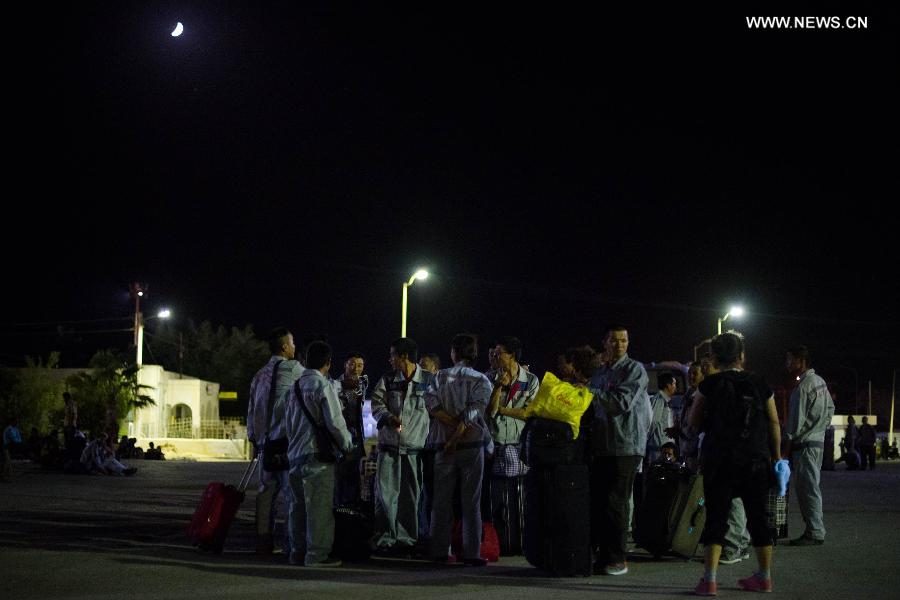 | Chinese evacuees gather after having their luggages checked at the Ras Jadir border control between Tunisia and Libya, late on Aug. 2, 2014. A total of 97 Chinese nationals, who had been evacuated from violence-hit Libya, entered Tunisia late Saturday.(Xinhua/Xu Yang) |