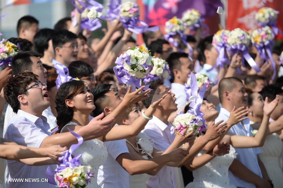 Couples throw up bundles of flowers during a group wedding ceremony in Shenyang, capital of northeast China's Liaoning Province, Aug. 2, 2014. The Qixi Festival, also known as Chinese Valentine's day, which falls on Aug. 2 this year, originates from a folk tale about a fairy falling in love with a mortal. The marriage allegedly enraged the Goddess of Heaven, who created the Milky Way to separate them. Supposedly, the pair of lovers are reunited for a single night each year by magpies that fly into the heavens and form a bridge for them to cross. (Xinhua/Pan Yulong)