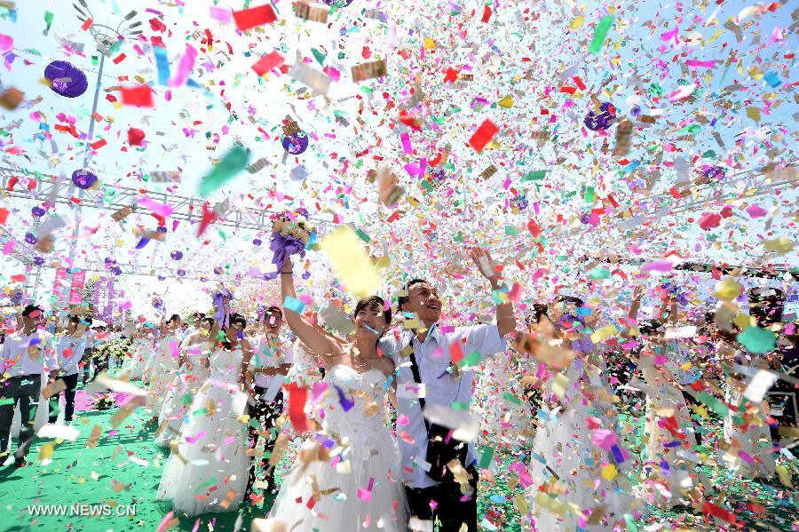 Couples throw up bundles of flowers during a group wedding ceremony in Shenyang, capital of northeast China's Liaoning Province, Aug. 2, 2014. The Qixi Festival, also known as Chinese Valentine's day, which falls on Aug. 2 this year, originates from a folk tale about a fairy falling in love with a mortal. The marriage allegedly enraged the Goddess of Heaven, who created the Milky Way to separate them. Supposedly, the pair of lovers are reunited for a single night each year by magpies that fly into the heavens and form a bridge for them to cross. (Xinhua/Pan Yulong)