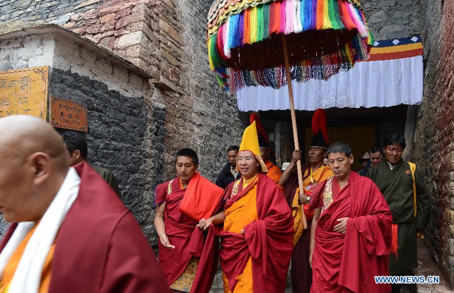 The 11th Panchen Lama Bainqen Erdini Qoigyijabu (C) walks into Sakya Monastery in Xigaze, southwest China's Tibet Autonomous Region, Aug. 2, 2014. A religious ceremony is held at Sakya Monastery, a prominent temple for Tibetan Buddhism's Sakya Sect, to celebrate the animal year of Panchen Lama Bainqen Erdini Qoigyijabu in the Chinese horoscope. There are 12 new year animals matching different lunar years in Chinese calendar, and every person takes on the animal sign of his or her birth year.(Xinhua/Chogo)