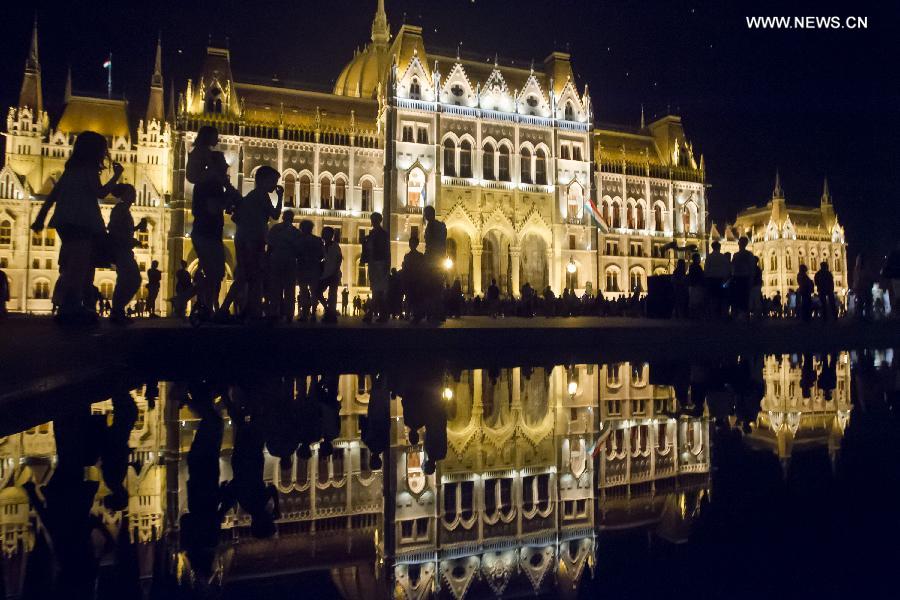 People watch the building of the Hungarian Parliament illuminated by new decorative lights in Budapest, Hungary, on Aug. 2, 2014. (Xinhua/Attila Volgyi)