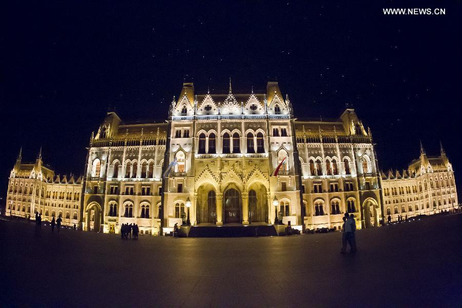 People watch the building of the Hungarian Parliament illuminated by new decorative lights in Budapest, Hungary, on Aug. 2, 2014. (Xinhua/Attila Volgyi)