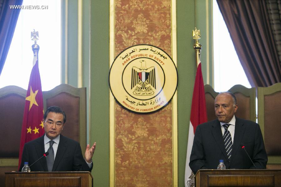 China's Foreign Minister Wang Yi (L) and his Egyptian counterpart Sameh Shoukry attend a joint press conference in Cairo, Egypt, Aug. 3, 2014. (Xinhua/Cui Xinyu)