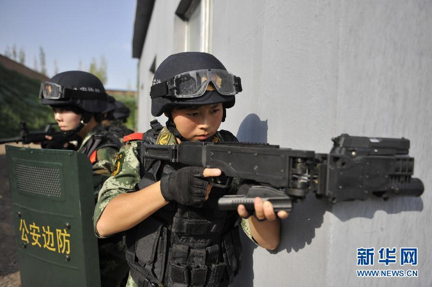 Zhang Fei (front) practices shooting with the “corner shot” on July 29, 2014. (Xinhua)