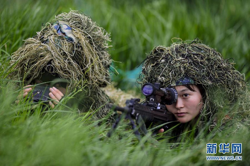 Li Huan (right) practices sniper skills with type 88 sniper rifle on July 29, 2014. (Xinhua)