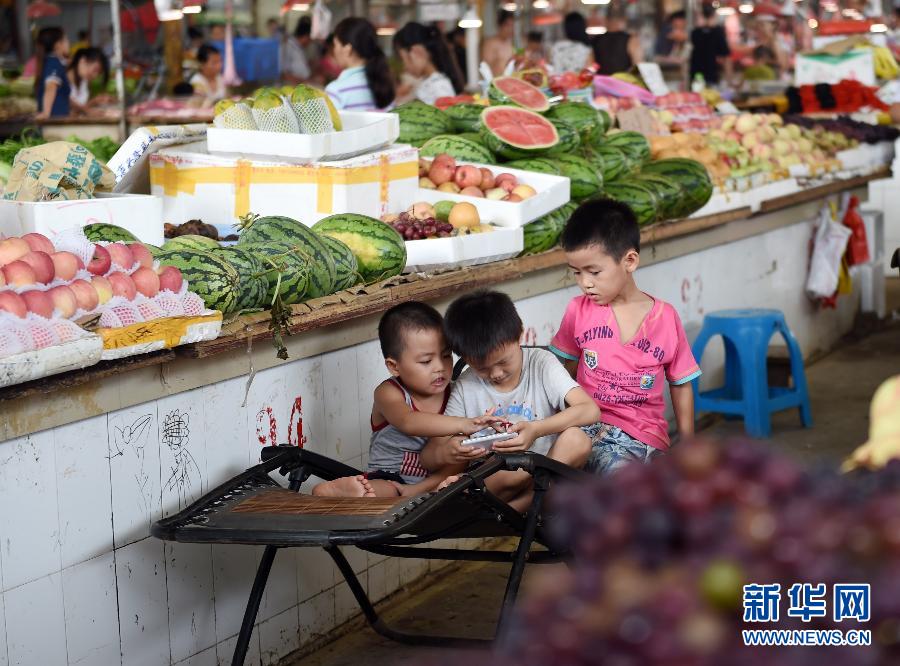 Three kids play mobile phone in Pangu farmers’ market of Nanning. (Xinhua/Lu Bo’an)