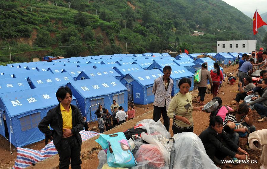 Photo taken on Aug. 4, 2014 shows the newly built temporary tents after an earthquake in Longtoushan township of Ludian county, southwest China's Yunnan Province. At least 398 people have been killed after a 6.5-magnitude earthquake rattled the province Sunday afternoon. (Xinhua/Chen Haining)