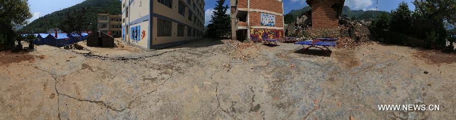 | Panoramic photo taken on Aug. 5, 2014 shows quake-hit Longtoushan Town of Ludian County, southwest China's Yunnan Province, Aug. 5, 2014. At least 398 people have been killed after a 6.5-magnitude earthquake rattled the province Sunday afternoon. The epicenter of the strong quake is in Longtoushan Town. (Xinhua/Xing Guangli) |