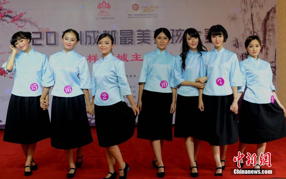 Girls display the beauty of Qipao (Mandarin Gown) and school uniforms with special features during the 2014 Chengdu Most Beautiful Contest with the blooming years as the theme in Chengdu, southwest China’s Sichuan province, August 2, 2014.(Chinanews.com/ Ye Jian)