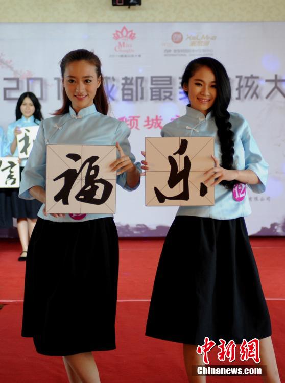 Girls display the beauty of Qipao (Mandarin Gown) and school uniforms with special features during the 2014 Chengdu Most Beautiful Contest with the blooming years as the theme in Chengdu, southwest China’s Sichuan province, August 2, 2014.(Chinanews.com/ Ye Jian)