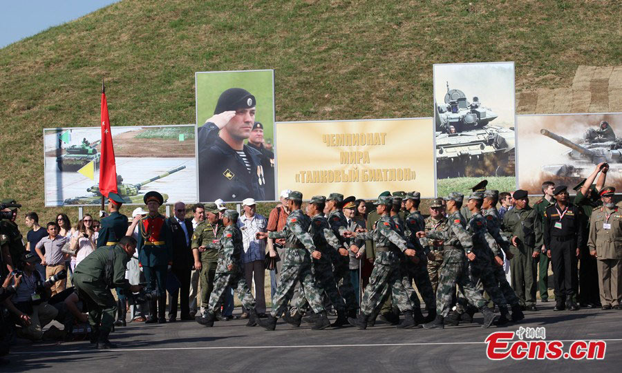 Chinese soldiers are seen at the tank biathlon championship in the Alabino firing range of Moscow region, Russia on August 4, 2014. (CNS/Jia Jingfeng)