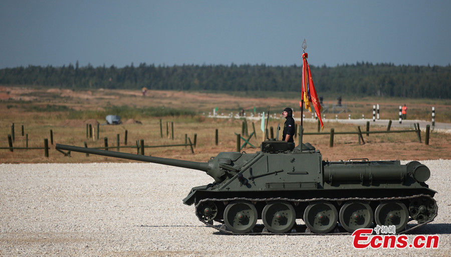 A tank biathlon championship is held in the Alabino firing range of Moscow region, Russia on August 4, 2014. (CNS/Jia Jingfeng)