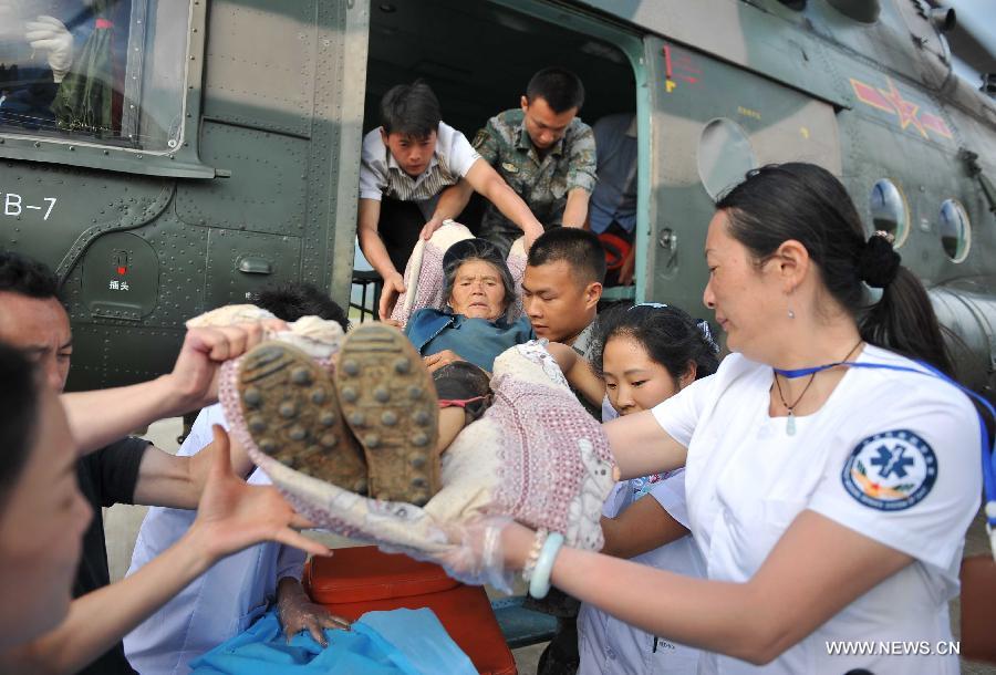 Medical workers carry an injured citizen out of a helicopter that has flown from Longtoushan Town of Ludian County, the epicenter of a 6.5-magnitude earthquake, to an airport in Zhaotong, southwest China's Yunnan Province, Aug. 5, 2014. Military helicopters have been deployed to transfer those who were injured in the earthquake that hit Yunnan and deliver disaster relief supplies. Air delivery is expected to avoid ground barriers after the quake and offer higher rescue efficiency. (Xinhua/Xue Yubin)