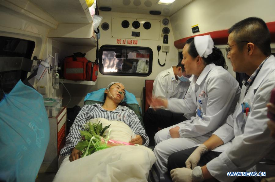 A person injured in quake-hit area is transferred by an ambulance after arriving at the Kunming Railway Station in Kunming, capital of southwest China's Yunnan Province, Aug. 5, 2014. The 6.5-magnitude earthquake that struck Yunnan's Ludian County on Sunday afternoon has left at least 410 people dead. (Xinhua/Hou Wenkun)