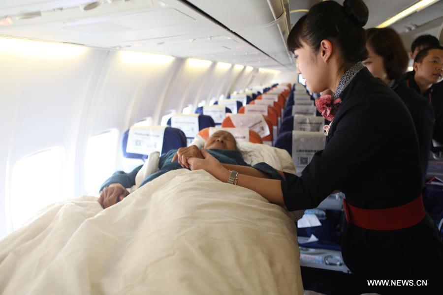 An old woman injured in earthquake is transferred by an airplane from Zhaotong City to Kunming, capital of southwest China's Yunnan Province, Aug. 5, 2014. The 6.5-magnitude earthquake that struck Yunnan's Ludian County of Zhaotong City on Sunday afternoon has left at least 410 people dead. (Xinhua)