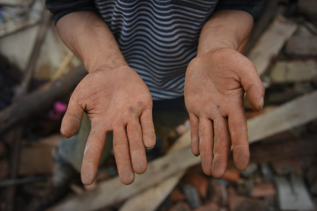 Bleeding blisters in Mao Changxue’s hands after he had been digging in the rubble by hand for 9 hours in search of his son. (youth.cn/ Wang Fei)