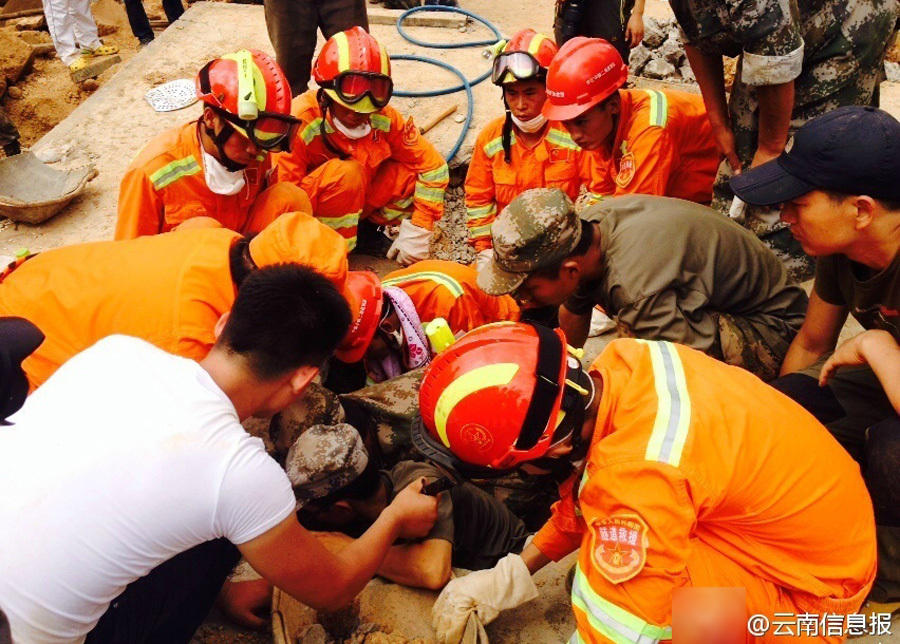 The rescuers locate the old woman who has been buried for more than 40 hours at 4:33 p.m. on August 5, 2014. (Photo/ynxxb.com)
