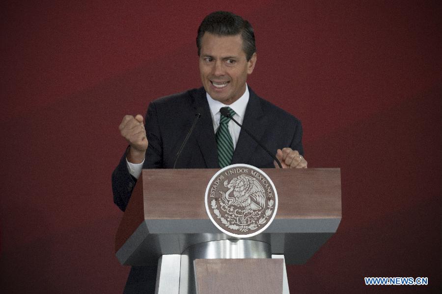 Mexican President Enrique Pena Nieto attends the flag ceremony of the Mexican delegation for the 2014 Nanjing Youth Olympic Games and for the men's and women's national teams of volleyball and the men's national team of basketball for the World Championships, at Los Pinos Official Residence in Mexico City, capital of Mecico, on Aug. 6, 2014. (Xinhua/Alejandro Ayala)