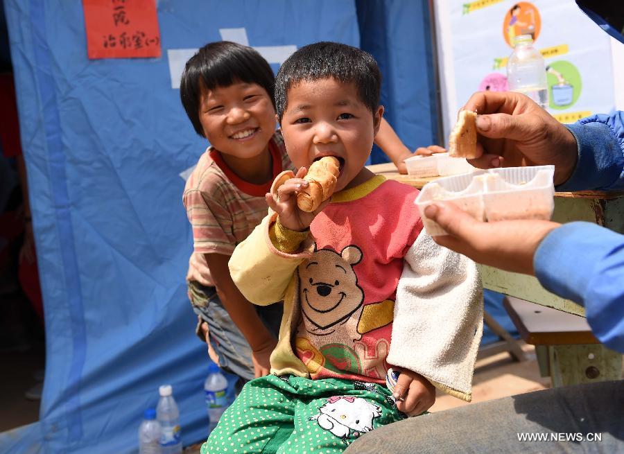 A kid eats a piece of bread in a temporary settlement set up after a 6.5-magnitude earthquake in Ludian County of Zhaotong, southwest China's Yunnan Province, Aug. 6, 2014. Disaster relief work is in progress after the earthquake struck Yunnan on Sunday afternoon. Civillians in temporary settlements within areas that are most severely affected have already had access to fresh meal and potable water. (Xinhua/Lin Yiguang)