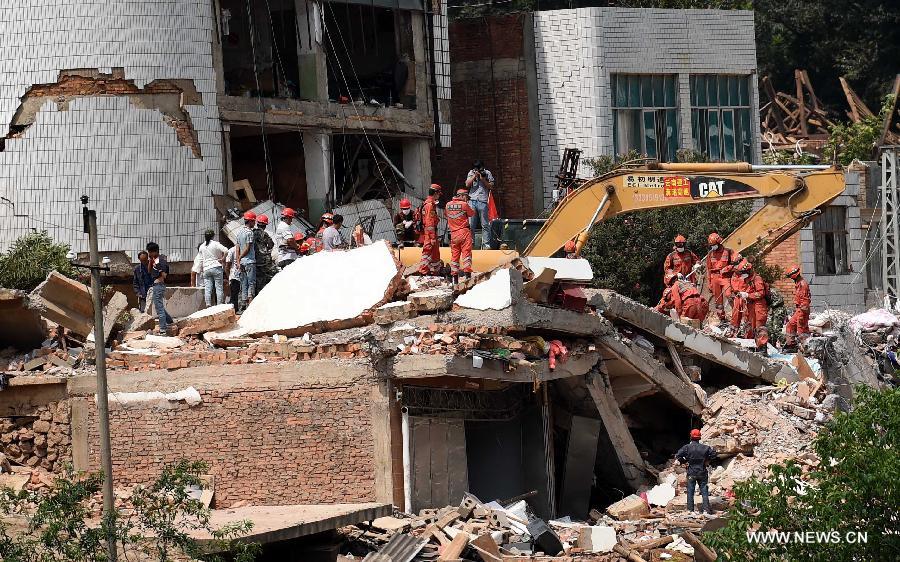 Rescuers look for survivors after a 6.5-magnitude earthquake in Ludian County of Zhaotong, southwest China's Yunnan Province, Aug. 6, 2014. Disaster relief work is in progress after the earthquake struck Yunnan on Sunday afternoon. Civillians in temporary settlements within areas that are most severely affected have already had access to fresh meal and potable water. (Xinhua/Lin Yiguang)