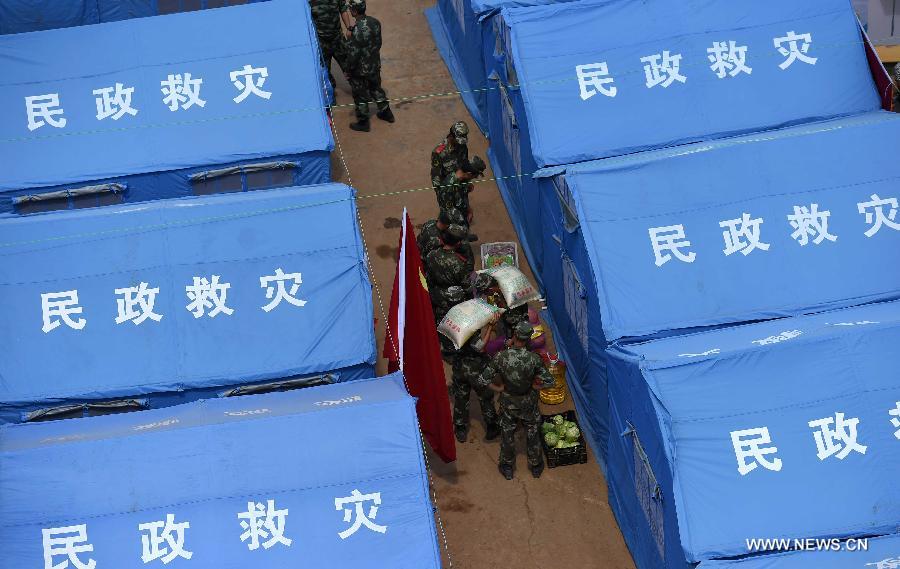Rescuers transport disaster relief supplies in a temporary settlement set up after a 6.5-magnitude earthquake in Ludian County of Zhaotong, southwest China's Yunnan Province, Aug. 6, 2014. Disaster relief work is in progress after the earthquake struck Yunnan on Sunday afternoon. Civillians in temporary settlements within areas that are most severely affected have already had access to fresh meal and potable water. (Xinhua/Lin Yiguang)