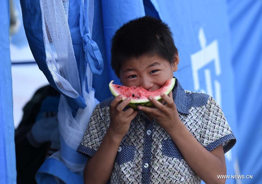 Zhang Xiwei, 9, eats watermelon at a temporary resettlement in quake-hit Longtoushan Town of Ludian County, southwest China's Yunnan Province, Aug. 7, 2014. (Xinhua/Lin Yiguang)