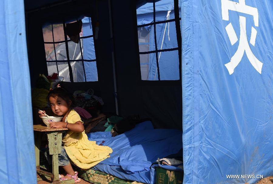 Zhou Lei, 4, eats meal at a temporary resettlement in quake-hit Longtoushan Town of Ludian County, southwest China's Yunnan Province, Aug. 7, 2014. (Xinhua/Lin Yiguang)