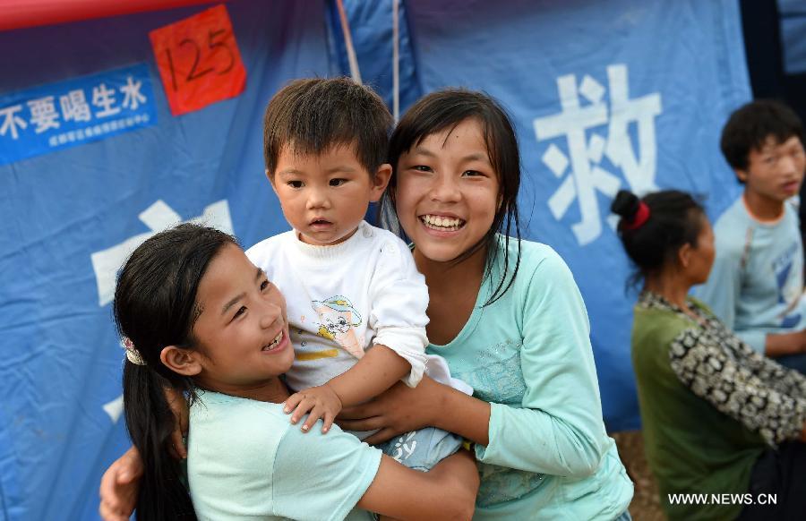 Young girls play at a temporary resettlement in quake-hit Longtoushan Town of Ludian County, southwest China's Yunnan Province, Aug. 6, 2014. (Xinhua/Lin Yiguang)