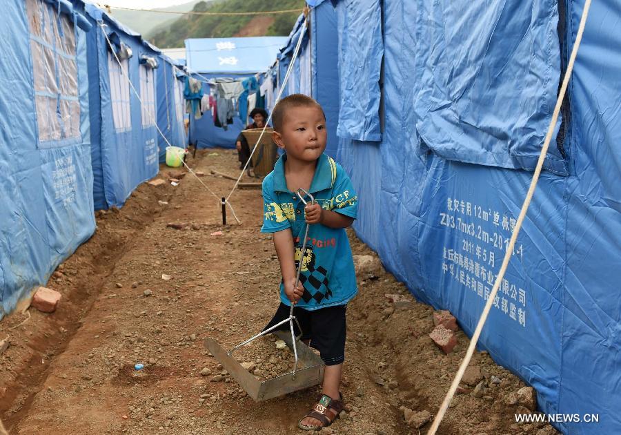 A young boy plays at a temporary resettlement in quake-hit Longtoushan Town of Ludian County, southwest China's Yunnan Province, Aug. 6, 2014. (Xinhua/Lin Yiguang)