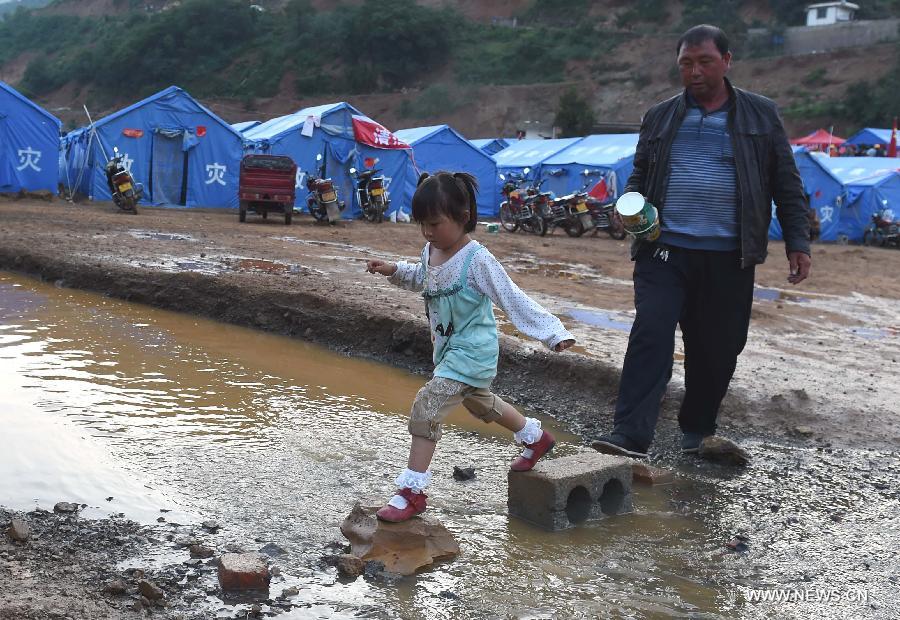 A young girl steps across a river near a temporary resettlement in quake-hit Longtoushan Town of Ludian County, southwest China's Yunnan Province, Aug. 6, 2014. (Xinhua/Lin Yiguang)