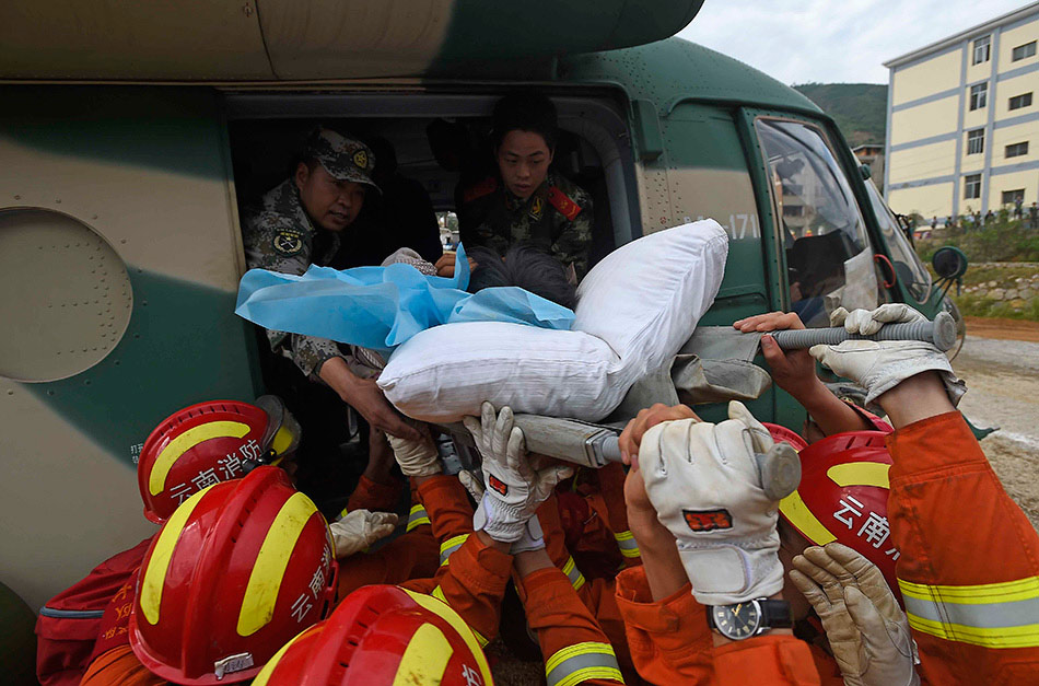 A helicopter prepares to transfer a severely wounded person on August 5, 2014. (Xinhua)