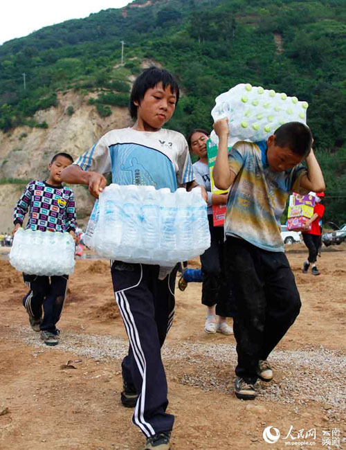 Several children carry disaster relief goods. (People's Daily Online/Li Faxing)
