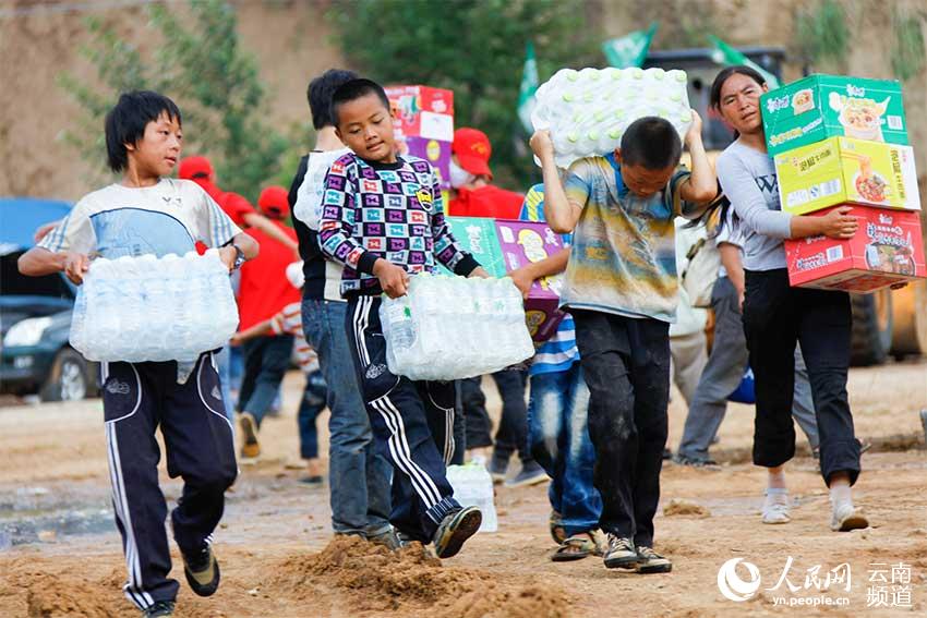 As the rescue routes are cleared, a batch of disaster relief goods is delivered to settlements in quake area. Quake-affected civilians, including children who have lost their family, help to distribute the goods at Lushan, southwest China's Yunnan province. (People's Daily Online)