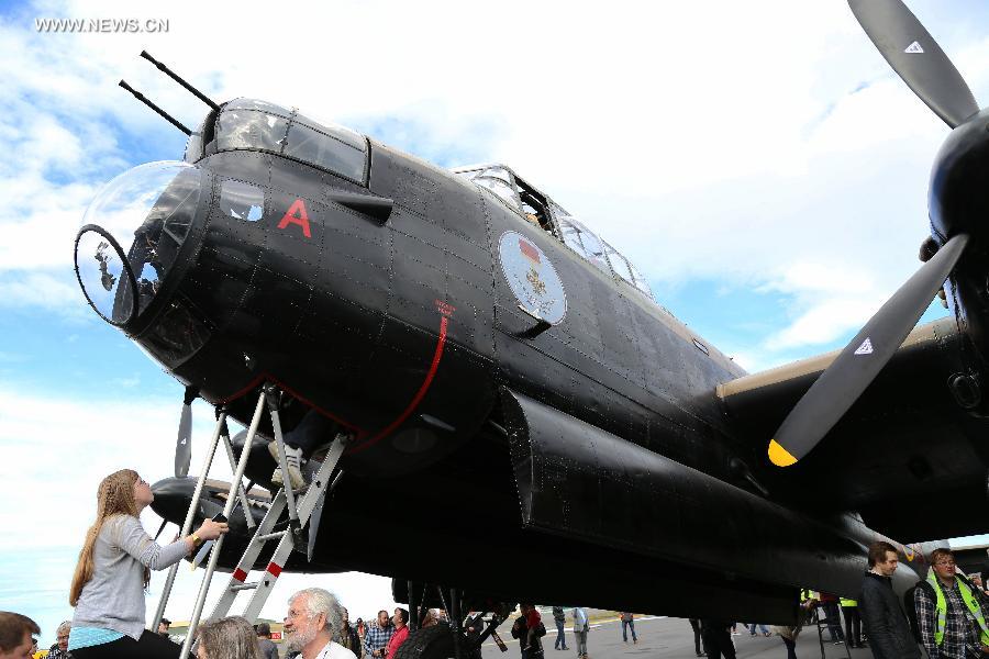 | People visit a World War II Lancaster bomber from Canada in Reykjavik, capital of Iceland, on Aug. 7, 2014. The vintage plane will continue its flight to England to join another airworthy Lancaster in several events and activities there. (Xinhua/Huang Xiaonan) |