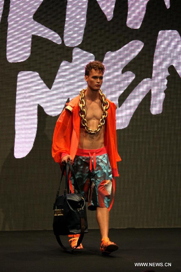 | A model presents a creation by Danish Designer Nicholas Nybro during the ongoing Copenhagen Fashion Week in Copenhagen, Denmark, Aug.7, 2014. (Xinhua/Wu Bo) |