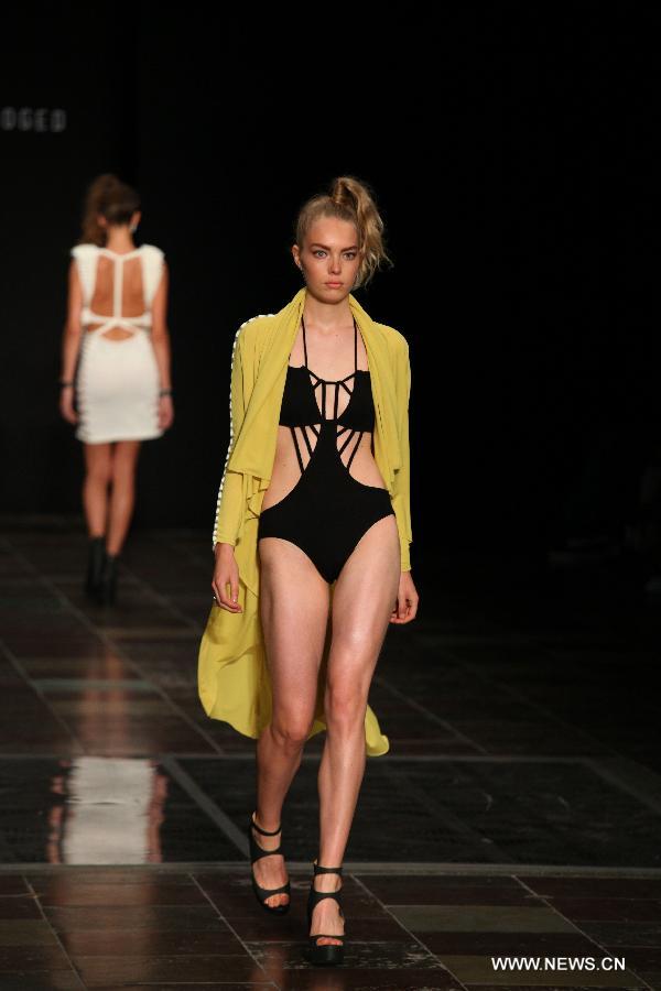 A model presents creations by Denmark's designer Stine Ladefoged during Copenhagen Fashion Week, in Copenhagen, Denmark, Aug. 7, 2014. (Xinhua/Wu Bo)