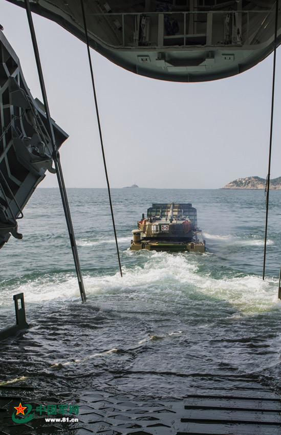 | On August 3, 2014, an amphibious armored vehicle unit of Nanjing Military Region successfully conducted an all-floating loading and beach landing drill in East China Sea. (www.81.cn/Jiang Jiangao) |
