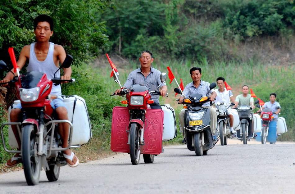 In order to meet the daily water demand of the elderly whose children are working outside of the county and people who are living alone, villagers and local militia spontaneously formed a team to send water. Villagers offer free water sources to the team. After getting the water, team members deliver it to each family by motorcycle. Team members usually have to walk three kilometers on the mountain path carrying 30 kilograms of water before they can arrive at the homes of the elderly.