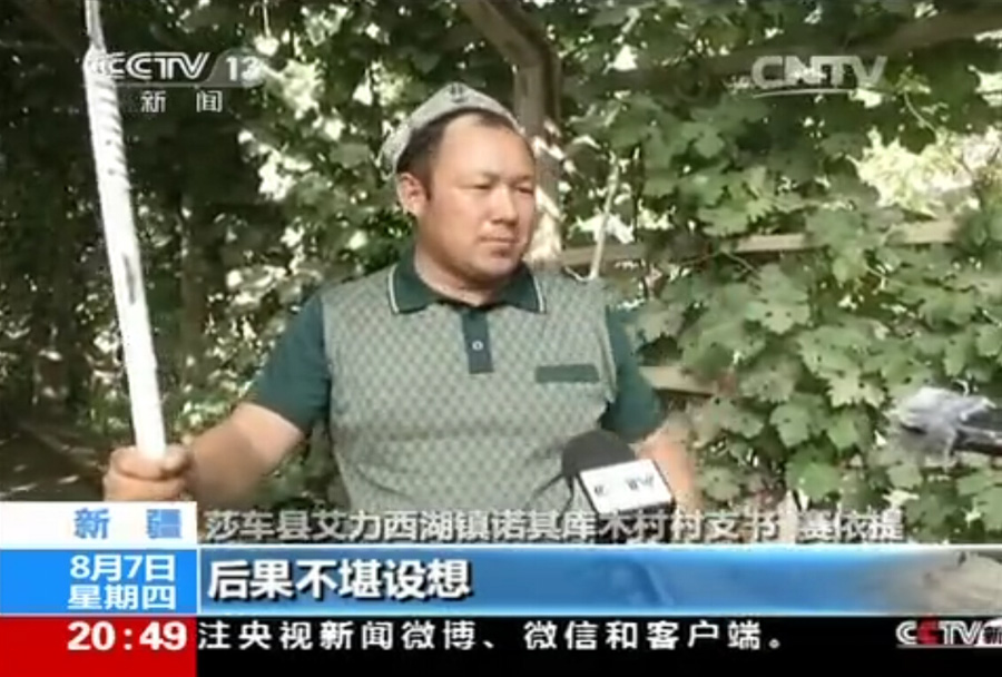 Saiyiti, the party branch secretary of Nuoqikumu Village, recalled: “The village committee has 13 spears. We can’t let them come in and take away those weapons.”(Screenshot of CCTV)