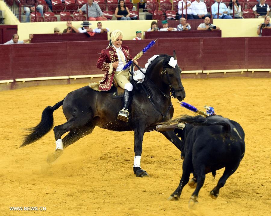 A matador performs during a traditional Portuguese bullfight at Lisbon's Campo Pequeno bullring, Portugal, Aug. 7, 2014. Portuguese bullfighting is different and far less gory than the Spanish version where the bull is stabbed to death if the matador manages to win the contest. (Xinhua/Zhang Liyun)