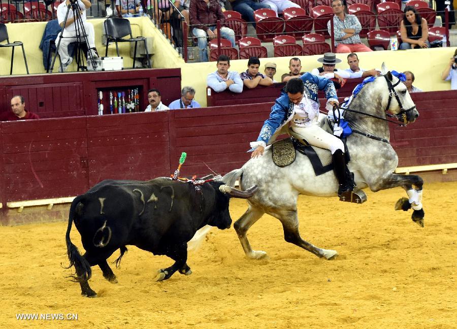 A matador performs during a traditional Portuguese bullfight at Lisbon's Campo Pequeno bullring, Portugal, Aug. 7, 2014. Portuguese bullfighting is different and far less gory than the Spanish version where the bull is stabbed to death if the matador manages to win the contest. (Xinhua/Zhang Liyun)