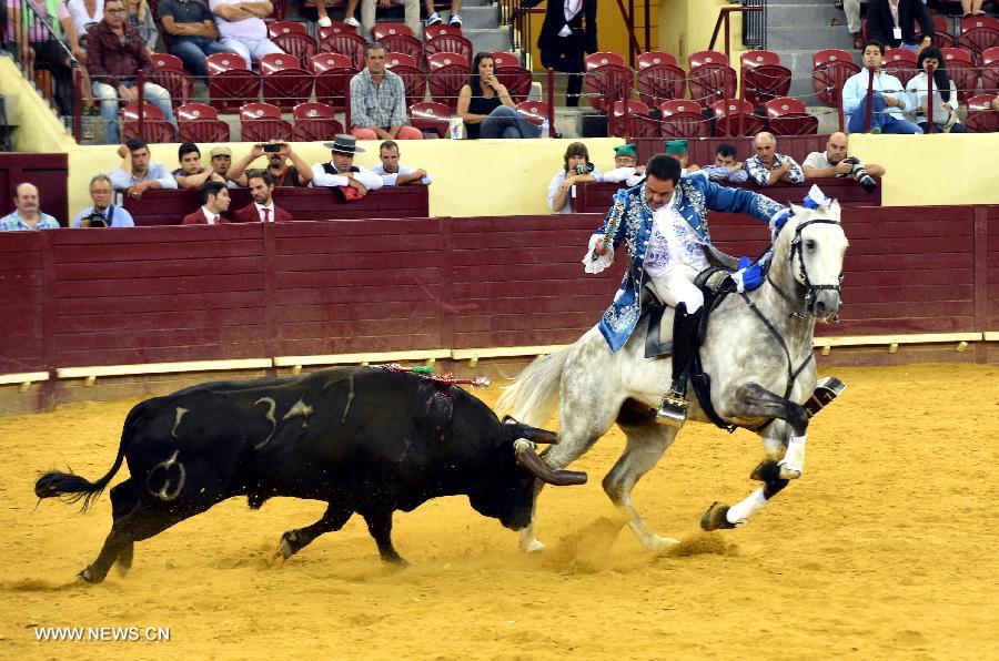 A matador performs during a traditional Portuguese bullfight at Lisbon's Campo Pequeno bullring, Portugal, Aug. 7, 2014. Portuguese bullfighting is different and far less gory than the Spanish version where the bull is stabbed to death if the matador manages to win the contest. (Xinhua/Zhang Liyun)