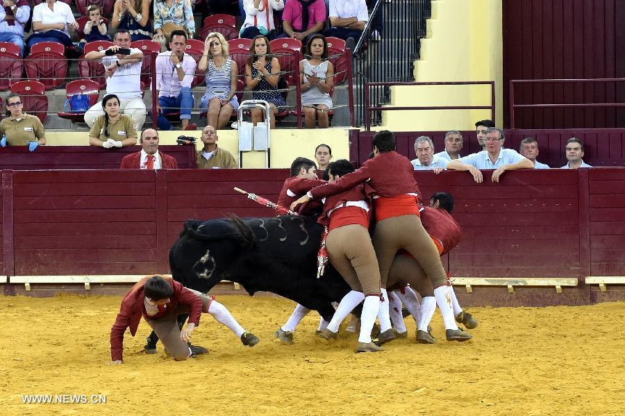 Portuguese matadors catch a bull during a traditional Portuguese bullfight at Lisbon's Campo Pequeno bullring, Portugal, Aug. 7, 2014. Portuguese bullfighting is different and far less gory than the Spanish version where the bull is stabbed to death if the matador manages to win the contest. (Xinhua/Zhang Liyun)