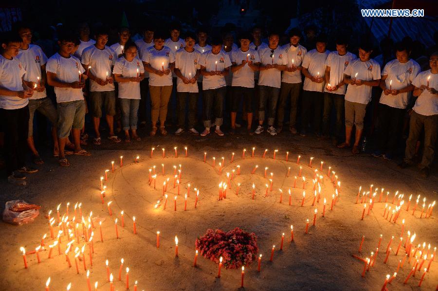 | People light candles to mourn for the victims after a 6.5-magnitude earthquake in Longtoushan Town under Ludian County of Zhaotong, southwest China's Yunnan Province, Aug. 8, 2014. Death toll from the quake that struck Yunnan on Sunday afternoon has risen to 617 as of 3:00 p.m. Friday. (Xinhua/Hu Chao) |