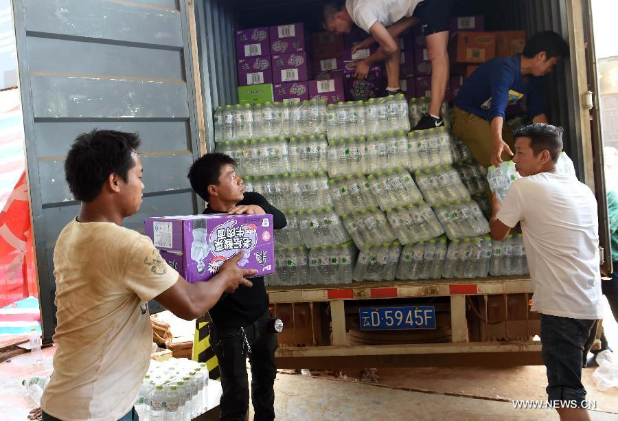 Workers unload relief materials in quake-hit Longtoushan Town of Ludian County, southwest China's Yunnan Province, Aug. 8, 2014. 44510 tents, 10000 emergency lights, 65997 overcoats have arrived in the quake stricken area. 11 villages of Longtoushan Town have already received relief materials.(Xinhua/Lin Yiguang)