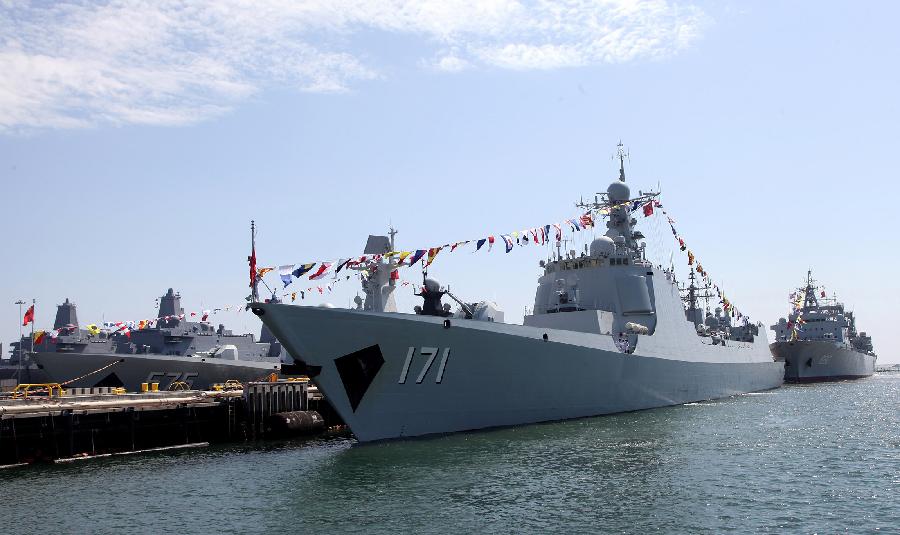 Chinese navy's Task Group 171, which include missile destroyer Haikou, missile frigate Yueyang and supply ship Qiandaohu, with a ship-borne helicopter and more than 700 soldiers and officers, anchors at Naval Base San Diego the United States, Aug. 10, 2014. The Chinese flotilla arrived at Naval Base San Diego on Sunday for a five-day visit after its debut in the world's largest maritime military drill. (Xinhua/Yu Lin)