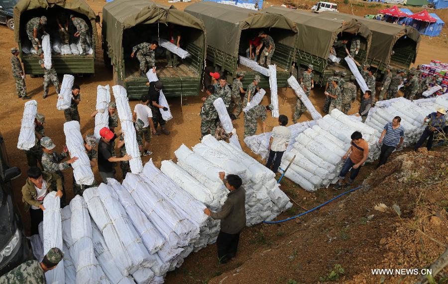 Soldiers carry the newly brought tents after a 6.5-magnitude earthquake in Ludian County of Zhaotong, southwest China's Yunnan Province, Aug. 10, 2014. Disaster relief work is in progress after the earthquake struck Yunnan. Civilians in temporary settlements within areas that are most severely affected have already had access to fresh meal and potable water. (Xinhua/Pei Xin)