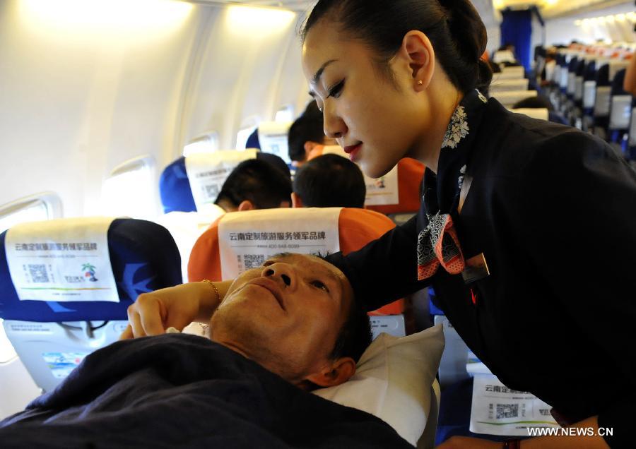 A flight attendant takes care of an injured person after an earthquake in Ludian County of Zhaotong, southwest China's Yunnan Province, Aug. 10, 2014. A 6.5-magnitude quake that struck Yunnan's Ludian County on Aug. 3 has left 617 people dead and 112 missing.(Xinhua/Chen Haining)