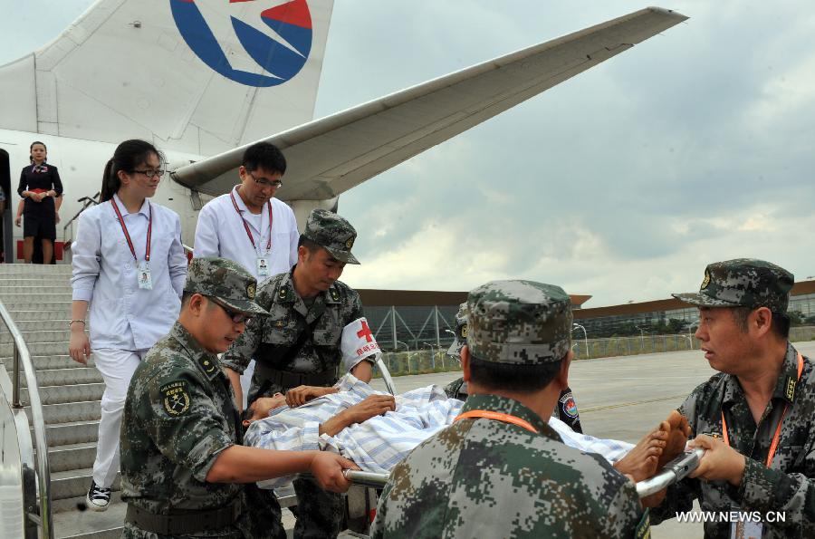 Soldiers transfer an injured person after an earthquake in Ludian County of Zhaotong, southwest China's Yunnan Province, Aug. 10, 2014. A 6.5-magnitude quake that struck Yunnan's Ludian County on Aug. 3 has left 617 people dead and 112 missing.(Xinhua/Chen Haining)